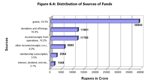 These NPIs received total 72792 Cr Rs funds in the year they were surveyed. It may be seen that 53.5% of the funding for these societies comes from grants while 16.4% is from donations and offerings and 16.2% from income/receipts from operations. The remaining 13.8% comes from other sources viz. other incomes/receipts, membership subscription and interest, dividend, rent etc.