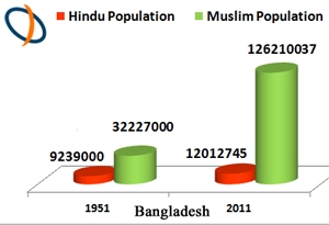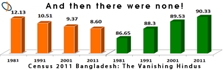 In terms of absolute numbers, the ‘Vanishing Hindu’ phenomenon becomes clearer. In 1951, the first Census after Bangladesh came in to existence [as East Pakistan at that time], Muslim population was 3 Crore 22 lakh [32 million] while Hindu population was 92 lakh 39000 [9 million]. After 60 years Muslim population is now 12 Crore 62 lakh [120 million] while Hindu population stands at just 1 Crore 20 lakh [12 million] people.