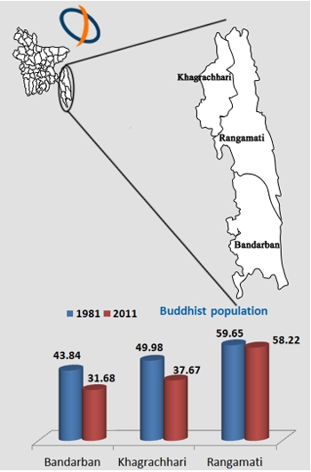 Along with Hindus, Buddhist population is also reducing in alarming manner. Buddhist people are concentrated in the Chitgong hill tract comprising of three districts Bandarban, Khagrachhari and Rangamati. In last three decades a large number of tribal Buddhist people have been displaced from the belt.