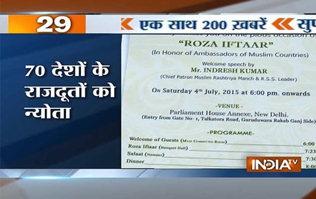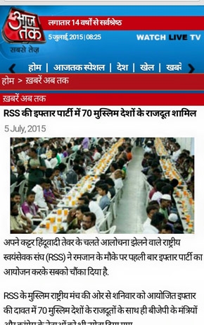 Media hype over RSS: For the media, the very presence of Indresh Kumar was enough to dub this event as ‘RSS exercise to win over Muslims’ to its side. “RSS organizes Iftar party for the first time”, said PTI headline, while The Hindu carried the news titled “RSS forum hosts Iftar at Parliament Annexe”. The Indiatvnews.com reported “In a first, Muslim wing of RSS to organize Iftar party today”. The ‘sab se tez’ channel ‘aajtak.intoday’ said: “RSS ne pahli baar ayojit ki Iftar party, 70 Muslim deshon ke Rajduton ne ki shirkat”. The Pune based Marathi daily Sakal reported “Sanghachi Dillit Iftar Party”; Amar Ujala carried the news “RSS ne di iftar party, nyaute ke baad bhi nahi aaye Modi”. The huffingtonpost.in too carried the news with similar headline that said “In a first, RSS’s Muslim Rashtriya Manch hosted Iftar party, Diplomats of Islamic countries attended”.