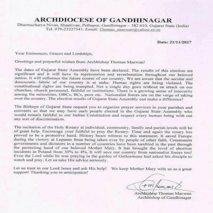 The Archbishop stated in an official communique dated Nov 21 that Gujarat elections are significant and have their repercussion and reverberations throughout our beloved nation and appealed to the Christians to pray for the victory of ‘humane leaders’ who ‘remain faithful to the Indian Constitution’ to ‘save India from nationalist forces’.