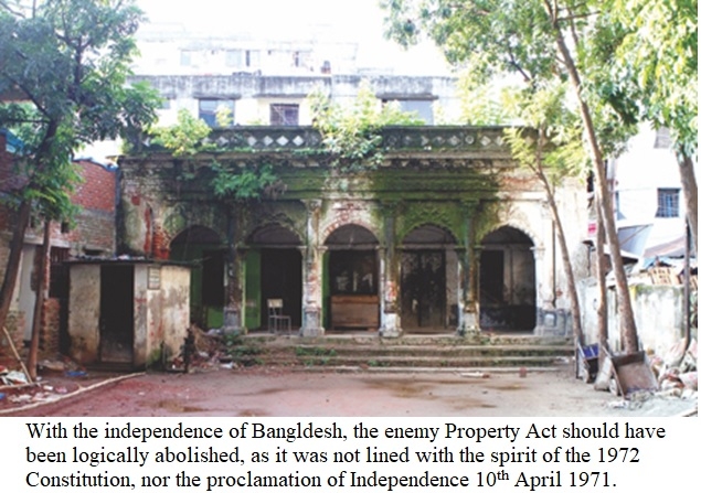 With the independence of Bangladesh, the Enemy Property Act should have been logically abolished, as it was not lined with the spirit of the 1972 Constitution, nor the proclamation of Independence 10th April 1971. But immediately after the liberation, the government of Bangladesh enforced on 26th March 1972, the Bangladesh Vested Property and Assets order, 1972, by virtue of which properties left behind by the Pakistanis while Enemy Properties were considered to be a single category. In 1974, when the government repealed the past 1969 Ordinance, it only meant that all enemy properties of firms which were entrusted to the custodians of enemy property in the then East Pakistan reminded vested in the Government of Bangladesh under the banner of Vested Property.