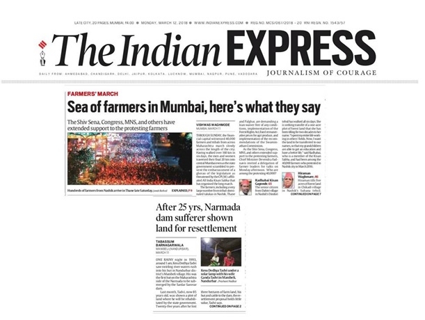 The first headline “Sea of Farmers in Mumbai, here’s what they say”, says “Through Sunday, the financial capital witnessed 40,000 farmers and tribals from across Maharashtra march slowly across the length of the city. Having walked over 160 km in six days, the men and women traversed their final 20 km into central Mumbai even as the state government scrambled to prevent the embarrassment of a gherao of the legislature as threatened by the CPI (M)-affiliated All India Kisan Sabha that has organised the long march.”