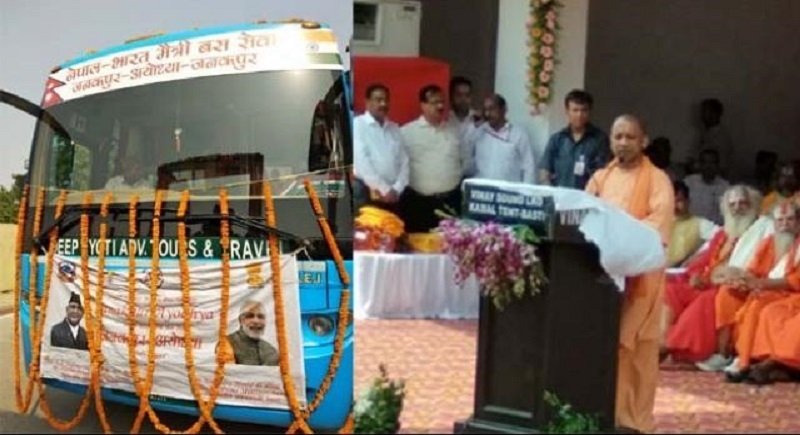 Ayodhya, May 12: Receiving the bus from Janakpur in Nepal to Ayodhya in India, Uttar Pradesh Chief Minister Yogi Adityanath exuded confidence that this venture will help strengthen the cultural relations between the two traditional neighbour.