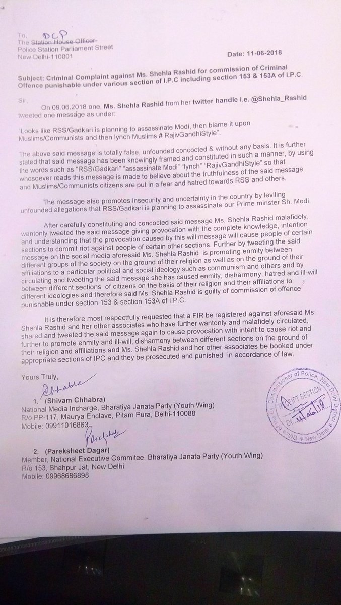 BJP in a complaint letter further said that the message posted on the official twitter account of Shehla Rashid is totally fales, unfounded concocted and without any basis. It is further stated that message has been knowingly framed and constituted in such a manner, by using the words such as “RSS/Gadkari” “assassinate Modi” “lynch” “RajivGandhiStyle”so that whosoever read this message is made to believe about the truthfulness of the said message and Muslim/Communists are put in fear and hatred towards RSS and others.