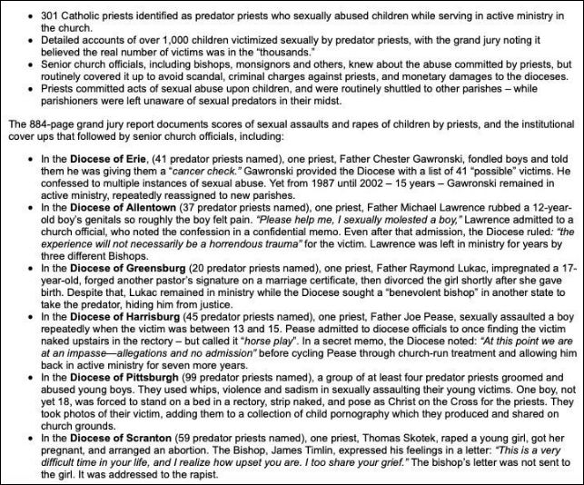 The report that covered six of the state’s eight Catholic dioceses and found more than 1,000 identifiable victims also added that there are likely thousands more victims whose records were lost or who were too afraid to come forward.