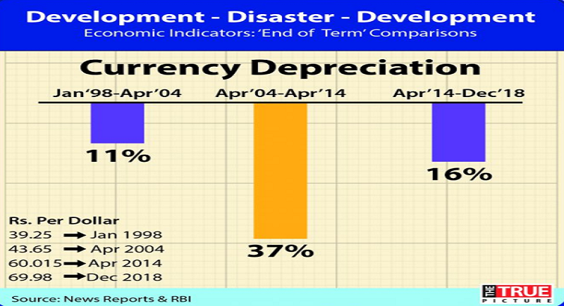 Depreciation in the value of Rupee against the US Dollar was another offensive move amongst others launched against the Modi government. Ironically, it is under the Congress-led UPA governments that rupee depreciated the most as can be seen from the graph, citing the data from the Reserve Bank of India. In the NDA reign under Vajpayee, the value of rupee against dollar was 39.25, whereas the same under the directive today measures around 70.