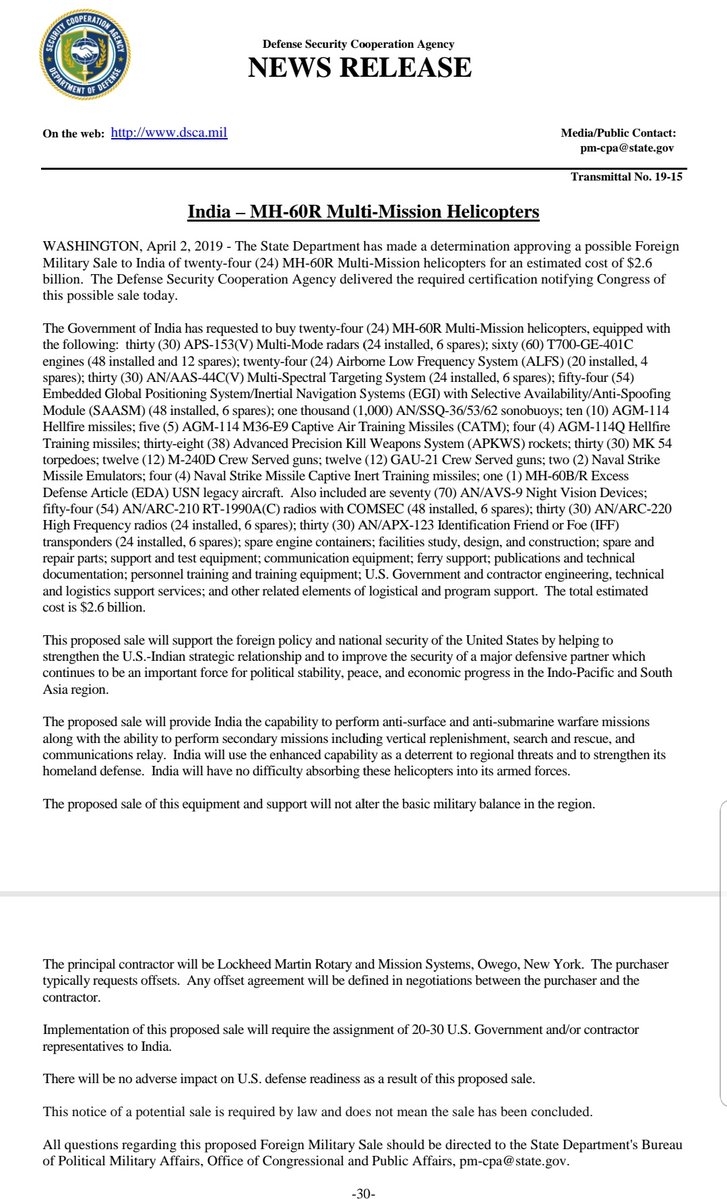 “The proposed sale will provide India with the capability to perform anti-surface and anti-submarine warfare missions along with the ability to perform secondary missions, including vertical replenishment, search and rescue, and communications relay. India will use the enhanced capability as a deterrent to regional threats and to strengthen its homeland defense,” the DSCA said.
