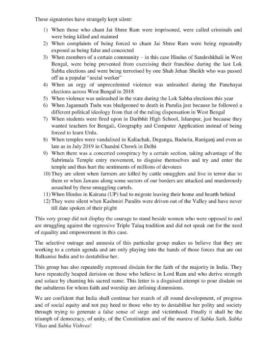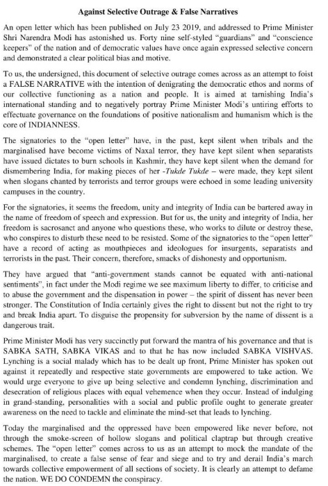 The letter by 62 personalities includes actor Kangana Ranaut, CBFC chief Prasoon Joshi and classical dancer Sonal Mansingh, instrumentalist Pandit Vishwa Mohan Bhatt, filmmakers Madhur Bhandarkar and Vivek Agnihotri etc. Slamming the 49 -styled 'guardians' and 'conscience keepers' of the nation, the letter published by them on July 23, 2019 aims at tarnishing India's international standing and to negatively portray Prime Minister Modi's untiring efforts to effectuate governance on the foundations of positive nationalism and humanism which is the core of Indianness.