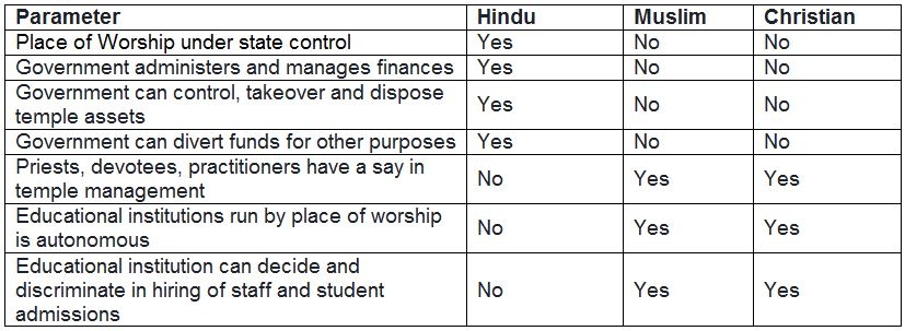 The table below explains the discrimination faced by Hindu places under the 1951 HRCE act.
