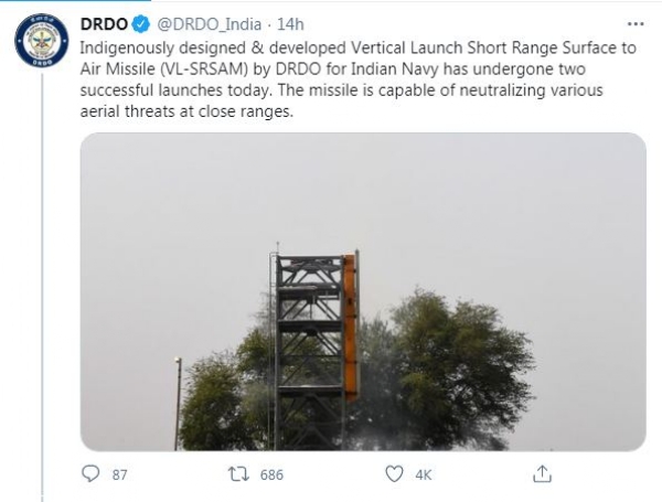DRDO ) conducted two successful launches of Vertical Launch Short Range Surface to Air Missile (VL-SRSAM). The launches were carried out from a static vertical launcher from Integrated Test Range (ITR), Chandipur off the coast of