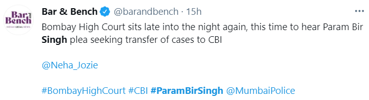 After hearing the parties at length for over an hour, the court at midnight said it now ceases to be a vacation bench, and hence the matter would have to be heard on Monday. "Since the matter is part heard, the State of Maharashtra in the meantime shall not arrest Param Bir Singh till the next date of hearing," the court said. The court noted that it had to hear the matter late as the state government was not willing to extend it statement made last week that it would not arrest Singh for a few more days.