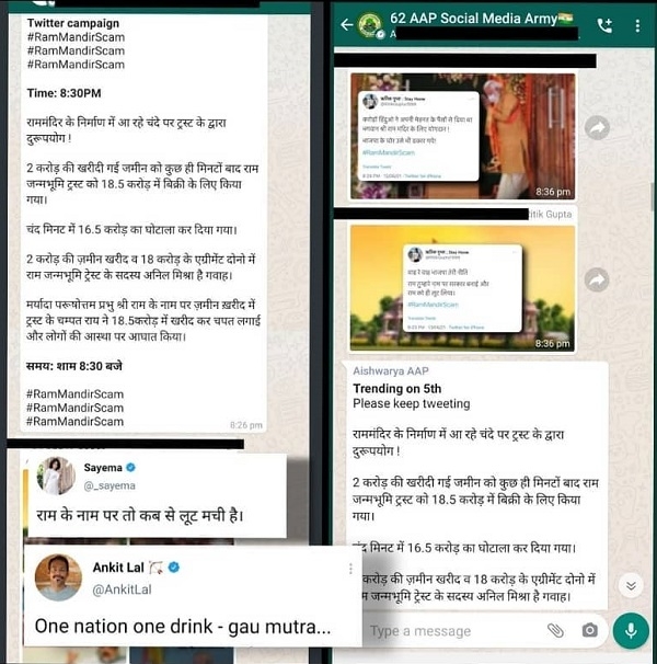I further want to add a twist to allegations made by Sanjay Singh and Pawan Pandey. This would bring anything but shame to the Aam Aadmi Party who is fueling the propaganda ahead of the UP State Assembly elections. AAP IT cells, '62 AAP Social Media Army' a whatsaap group is busy preparing and sharing toolkits against the Ram Mandir issue. "Please keep tweeting- Misuse of Ram Mandir donations", says Aishwarya, one of the AAP social media soldiers. Is this how Hindus are vilified in this country? Is this even secularism? Well, its stupid to talk about secularim when it comes to social media, especially the Twitter. Anyway!