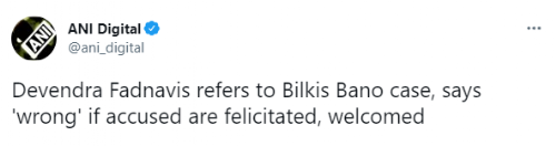 Mumbai, August 24: The convicts in 2002 Bilkis Bano case of Gujarat were released following a Supreme Court order, but it was wrong if a person accused of crime is "felicitated" and there can be no justification for such an act, said Maharashtra Deputy Chief Minister Devendra Fadnavis.
