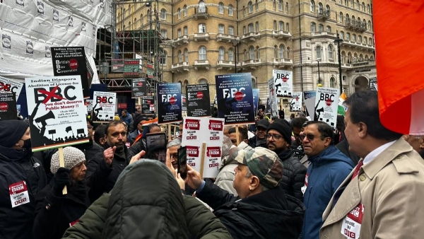 London, Jan 30: The Indian diaspora on Sunday (Jan 29) held a protest against the release of the BBC documentary on Prime Minister Narendra Modi at their Headquarters in Portland Place.