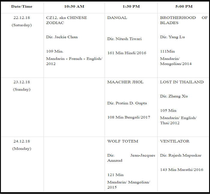 The opening film of the Festival will be ‘CZ12’ also known as ‘Chinese Zodiac’. The list of Indian films to be screened includes ‘Dangal’ (Hindi), ‘Maacher Jhol’ (Bengali) and ‘Ventilator’ (Marathi). However all the films will carry english subtitles, reported the statement.