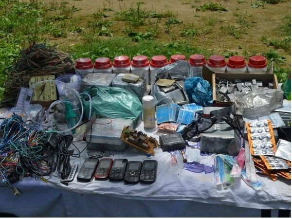Besides detonating material, connecting wires, electric chargers, batteries, mobile phones and remote control activating devices and some items marked with symbols of Pakistan were seized.
