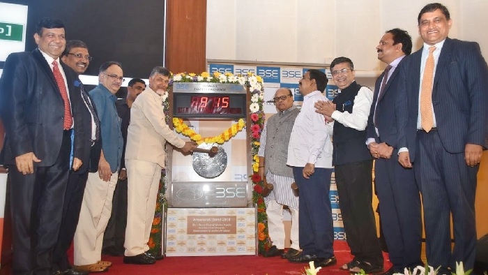 Mumbai, Aug 27: Andhra Pradesh Chief Minister Nara Chandrababu Naidu’s pet project ‘Amaravati Bond’ today officially got listed on Bombay stock exchange. The Chief Minister rang the opening bell to mark the listing ceremony of 'Amaravati Bond 2018'.