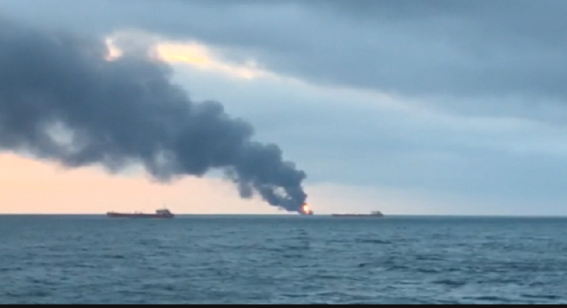 Russian rescuers are trying to reach sailors who jumped overboard. Fourteen people have so far been rescued. The fire broke out when one vessel was transferring fuel to another, Russian maritime agency spokesman Alexei Kravchenko said, adding that this had then forced several crew members to jump overboard.