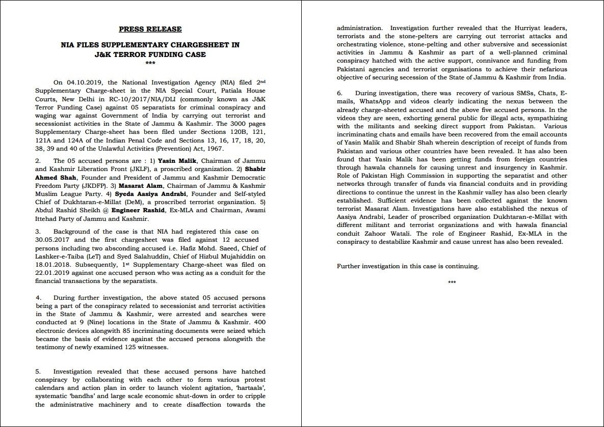 Arrested on April 4, 2019, for his role in fomenting unrest in Kashmir, NIA filed the second supplementary charge sheet of 200 pages in the terror funding case against JKLF chief Yasin Malik and as well as the founder and President of the Jammu and Kashmir Democratic Freedom Party Shabir Shah, Dukhtaran-e-Millat chief Asiya Andrabi, All Party Hurriyat Conference General Secretary Masarat Alam and former MLA Rashid Engineer.