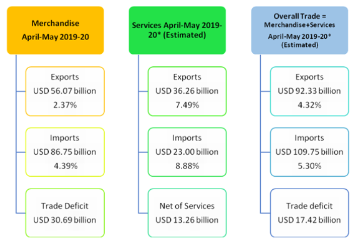 As per the latest RBI release dated 14th June, the exports quantum in the month of April this year was Rs 1,25,399.77 crore. The trade deficit meanwhile stands estimated at USD15.36 billion as against the deficit of USD 14.62 billion in May 2018 for the merchandise sector while the overall trade deficit for April-May 2019-20 remains estimated at USD 17.42 billion.
