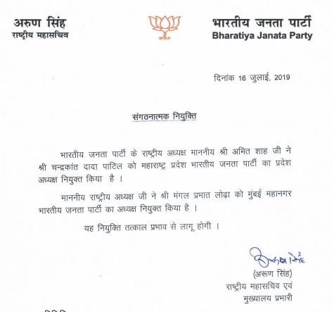 Mumbai, July 16: Waking ahead in the Maharashtra assembly elections, the BJP on Tuesday appointed Revenue Minister Chandrakant Patil and party MLA Mangal Prabhat Lodha as presidents of the state and Mumbai city units, respectively.