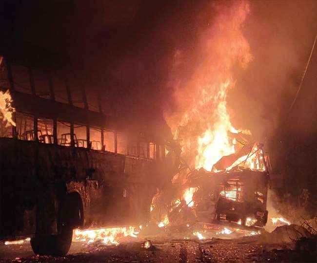 Kannauj, January 11: A sleeper bus going from Gursahaiganj to Jaipur collided with the truck on GT Road on Friday. The accident was so severe that the diesel tank of the truck exploded. This caused both the truck and the bus to catch fire. The passengers stuck in the sleeper bus could not get a chance to leave. Nearly 20 passengers are feared to have lost lives in the accident. 22 passengers have been admitted to the district hospital. The Chief Minister has instructed the top officials to reach the spot.