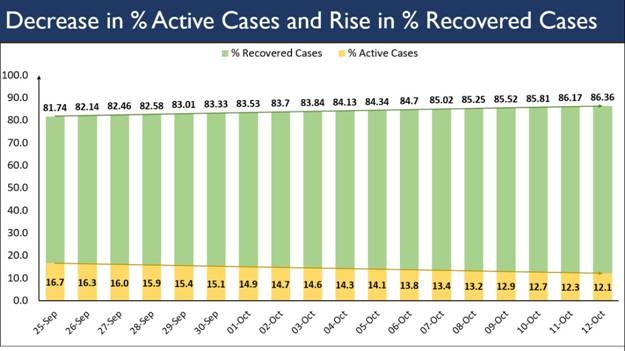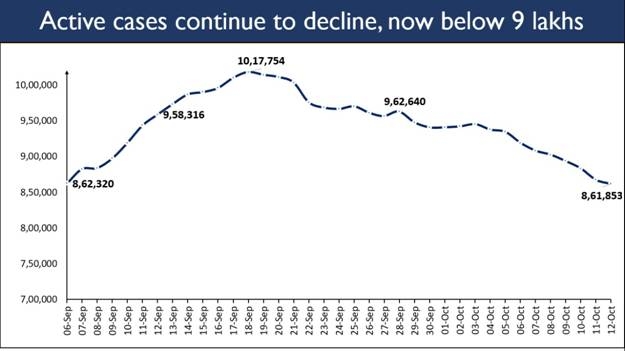 New Delhi, October 12: In a merry Monday morning COVID-19 update, India continues to report a trend of steadily decreasing active cases for the fourth day after the active cases dropped below the 9 lakh mark. This is after a month and the decline continues unabated, the Ministry of Health and Family Welfare stated in its report.