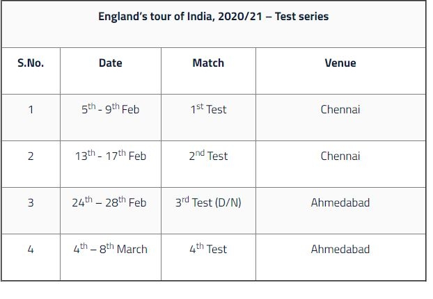 New Delhi, Dec 10: The Board of Control for Cricket in India (BCCI) along with the England and Wales Cricket Board (ECB) on Thursday announced the fixtures for Team India’s home series against England. The much-awaited series will kickstart with a 4-match Test series for Anthony de Mello Trophy starting from 5 February in Chennai.
