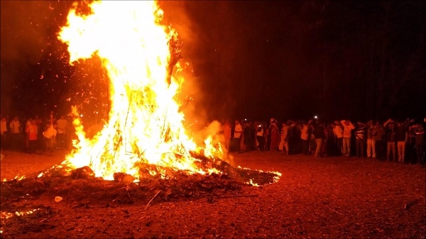 Now, this is interesting! The Bhils in Rajasthan and Madhya Pradesh have their own special way to mark the festival. They light a bonfire on the eve and worship the goddess. Villagers bring kesudo and mango spring flowers and grains signifying new life. When the fire is lit, loud cries of Holimata rend the air. Young people in the tribes have their own reason to look forward to the festival as they are allowed to form close communication leading into marriages on Holi.