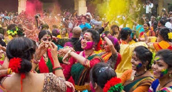 In Bengal, Holi is known by many names such as Dol Purnima, Dol Jatra, and Swing Festival. On the Dol Purnima, the devotees take turns to swing while women dance around the swing and sing devotional songs. The Dol Jatra is celebrated the next day where a procession of idols of Lord Krishna and Radha is taken out in the palanquins on the main streets accompanied by music, frolic and smearing colors on each other’s faces.
