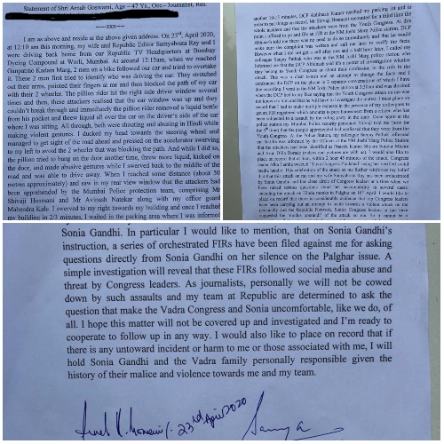 “They had tailed me and they were given information by higher ups to attack me,” Goswami said. “I want to tell you Sonia Gandhi, you are the biggest coward in the country right now. You have no guts to face me. I will hold you personally responsible for any consequences of any attack on me. If anything were to happen to me, it is Sonia Gandhi who is responsible", he added.