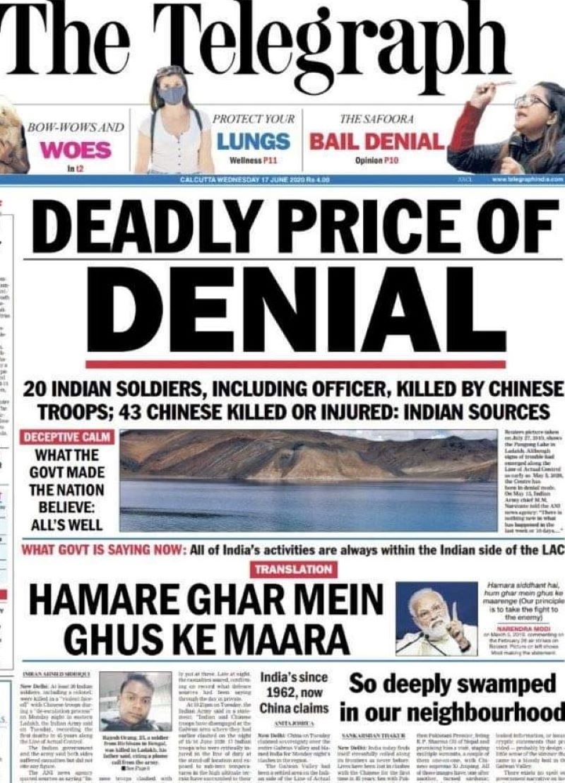 The headline in The Telegraph’s June 17, 2020 issue read as follows: “Hamare Ghar mein Ghus ke Mara”. It mischievously interprets the government's stand on development works within out border. Also blamed the government for ‘deceiving the nation’.
