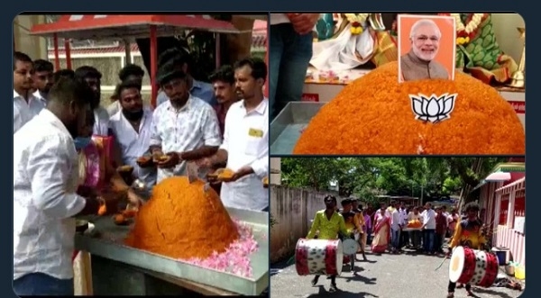 Ahead of PM Narendra Modi's birthday BJP Youth workers offered a 70-kg laddoo at Sri Kamatchi Amman Temple and distributed it among people in Coimbatore. #PMModi #Coimbatore #BJP pic.twitter.com/KQcbJEAjPV