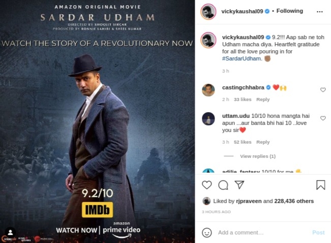On Instagram, Vicky Kaushal announced the film's current IMDb score is 9.2. The film is currently one of the highest-rated Hindi films on the website. As the caption, Kaushal wrote, “9.2!!! Aap sab ne toh Udham macha diya. Heartfelt gratitude for all the love pouring in for Sardar Udham.” The actor's fans cheered for him and said they want the film to score 10/10. A fan wrote, “10/10 hona mangta hai apun ...aur banta bhi hai 10 ..love you, sir.”