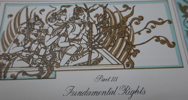 In the Part III: Fundamental Rights, it has been depicted by an illustration of Rama, Lakshman, Sita.