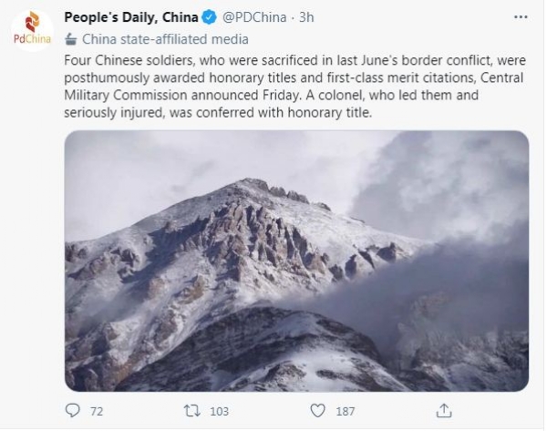 'Four Chinese frontier officers and soldiers stationed in the Karakoram Mountains have been recognized by the Central Military Commission of China (CMC) for their sacrifice in the border confrontation with India, which occurred in the Galwan Valley in June 2020, the PLA Daily', the official newspaper of the Chinese military reported on Friday.