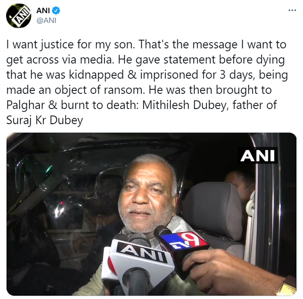 Meanwhile, the father of the deceased Navy sailor, Mithilesh Dubey, had demanded justice for his son. He said, “I want justice for my son. That’s the message I want to get across via media. He gave a statement before dying that he was kidnapped and imprisoned for three days, being made an object of ransom. He was then brought to Palghar and burnt to death.”