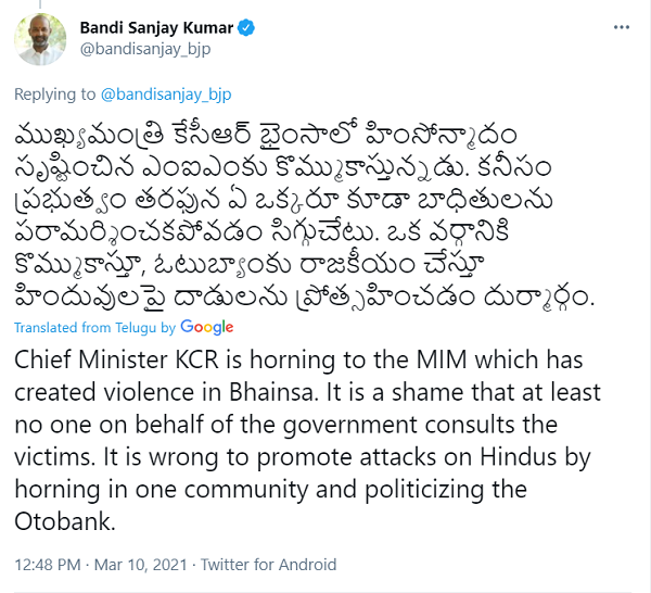 He said that there have been a series of communal clashes in Bhainsa for the last few years. "This happened only because of the inefficiency of the police department and the police department had been working under the pressure of Telangana Rashtra Samithi (TRS) and AIMIM parties in the state". He further said that the police have registered cases on 100 people, out of which 50 people are Hindus and 50 Muslims. A similar incident took place in January 2020 and even then most of the damage occurred to the Hindus as their houses and vehicles were destroyed and damaged.
