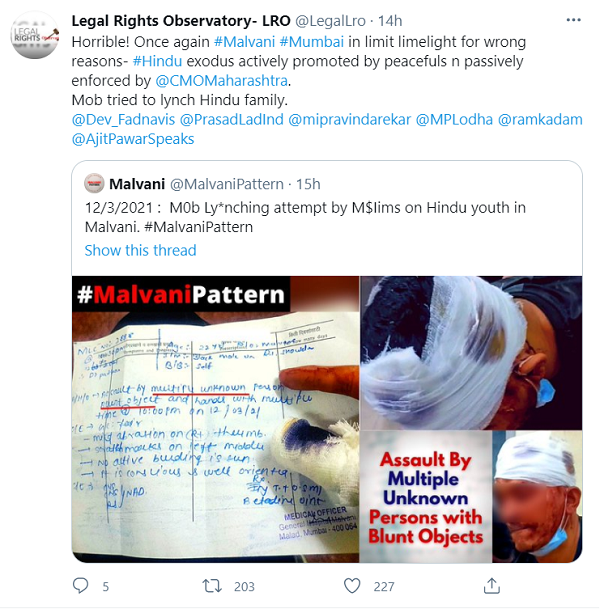 The men destroyed the food stall, abusing them and hitting them saying 'Maaro Kafiro ** ko', '** NepaIi'. One of them grabbed a rod and hit the elder brother on his head who felt unconscious and started bIeeding. They also threatened, said, "We won't leave you alive" and robbed the gold chain of the elder brother. The Charkop Police as noted, made the victim sit for 4-5 hours in the station before registering the complaint and eventually failed to register the case of robbery saying the chain must have fell off. The accused are all residents of Malvani who's MLA Aslam Shaikh is now a minister of MVA govt.