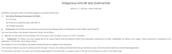 The Minister admitted to delays in the delivery process and also informed about delays in delivery of the Submarines being constructed in Mazgaon Dockyard Limited (MDL), Mumbai. "The deliveries of aircrafts have been delayed due to the supply chain disruptions caused by the COVID-19 pandemic."