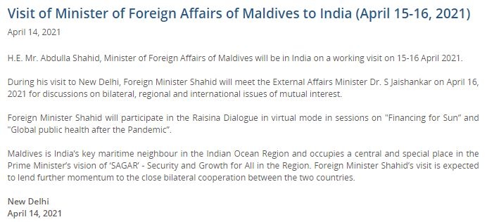 "Foreign minister Shahid will participate in the Raisina Dialogue in virtual mode in sessions on ‘Financing for Sun’ and ‘Global public health after the Pandemic’, " the statement added.