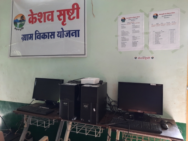 Dongirpada was chosen to be an ‘Adarsh gram’ or ‘Model village’ and more activities were added. Keshav Srushti got some large hearted urban friends to help set up a ‘samaaj mandir’ (community hall) with astro-turfed play area. This one hall has activities like tailoring classes, a very small library, two computers out of 60 donated by a bank, weekly bhajans and village meetings. Balance computers were given to 29 other villages in this region. A young lady, Harshada, takes studies of all the 22 children and also inculcates good habits in them. She has even prepared a handwritten booklet profiling her village. Such profiles have been prepared for all the 75 villages adopted by Keshav Srushti.