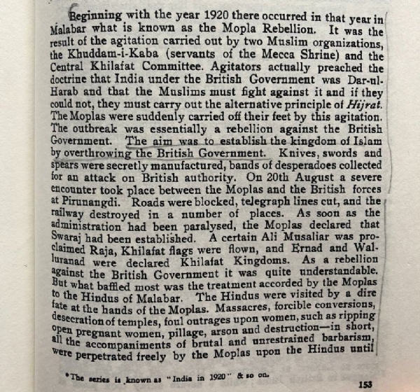 Talking about the genocide, Ambedkar wrote, "The aim was to establish the kingdom of Islam by overthrowing the British Government. Knives, swords and spears were secretly manufactured, and bands of desperadoes were collected for an attack on British authority.