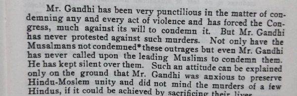 He said, "Mr Gandhi has never protested against such murders. Not only have the Muslims not condemned these outrages but even Mr Gandhi has never called upon the leading Muslims to condemn them. He has kept silent over them. Such an attitude can be explained only on the ground that Mr Gandhi was anxious to preserve Hindu-Moslem unity and did not mind the murders of a few Hindus if it could be achieved by sacrificing their lives." (Pakistan or Partition of India, pages 147)
