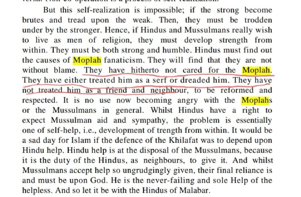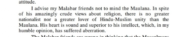 He further attacked Gandhi saying the Malabar genocide was too heavy a price for Hindu-Moslem unity. "All over Southern India, a wave of horrified feeling had spread among the Hindus of every shade of opinion, which was intensified when certain Khilafat leaders were so misguided as to pass resolutions of ‘congratulations to the Moplahs on the brave fight they were conducting for the sake of religion’. Any person could have said that this was too heavy a price for Hindu-Moslem unity. But Mr Gandhi was so obsessed with the necessity of establishing Hindu-Moslem unity that he was prepared to make light of the doings of the Moplahs and the Khilafats who were congratulating them. He spoke of the Moplahs as the ‘brave God-fearing Moplahs who were fighting for what they consider as religion and in a manner which they consider as religious," he said. (Pakistan or Partition of India, pages 147, 148)