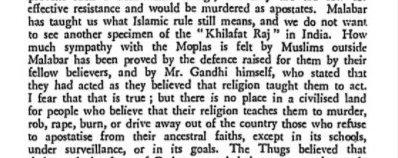 Ambedkar further continued, "Malabar has taught us what Islamic rule still means, and we do not want to see another specimen of the Khilafat Raj in India. How much sympathy for the Moplas is felt by Muslims outside Malabar has been proved by the defence raised for them by their fellow believers, and by Mr Gandhi himself, who stated that they had acted as they believed that religion taught them to act. I fear that that is true; but there is no place in a civilised land for people who believe that their religion teaches them to murder, rob, rape, burn, or drive away out of the country those who refuse to apostatise from their ancestral faiths, except in its schools, under surveillance, or in its goals."