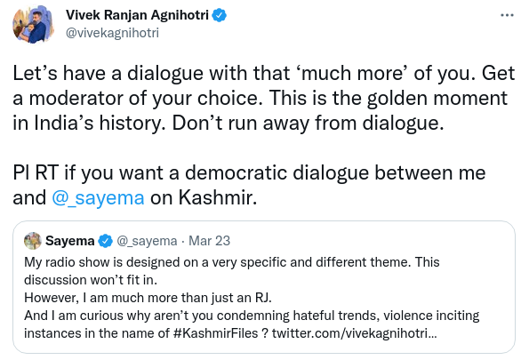 "However, I am much more than just an RJ. And I am curious why aren’t you condemning hateful trends, violence-inciting instances in the name of #KashmirFiles?", she asked. Replying, Agnihotri said, "Let’s have a dialogue with that ‘much more of you. Get a moderator of your choice. This is the golden moment in India’s history. Don’t run away from dialogue."