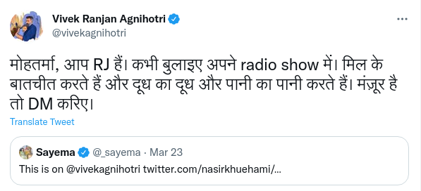 Sharing the video, Sayema has blamed Vivek Agnihotri for this behavior of the public towards Kashmiri Muslims. She tweeted, "This is on Vivek Agnihotri". This has resulted in a war of words between both of them. The director has asked her to call on her show in order to get the facts straight. Responding to this, she said, her radio show "is designed on a very specific and different theme and discussion won’t fit in."