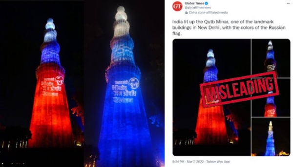 Correcting claims, PIB fact-checked Global Times & said, “Global Times has claimed in a tweet that Qutub Minar was lit up with the colours of the Russian flag. This claim is misleading."